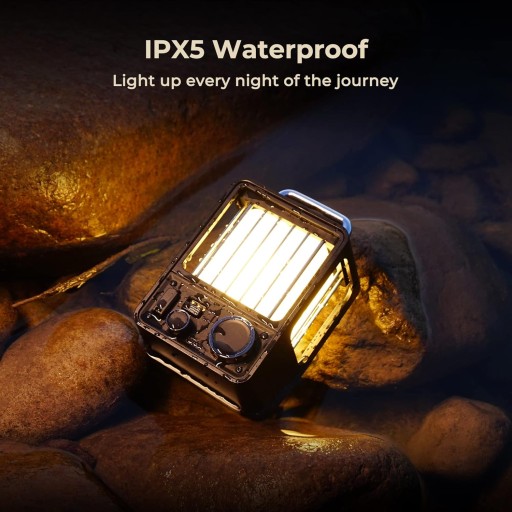 - Zewnętrzna lampa kempingowa ma stopień wodoodporności IPX5 i zapobiega rozpryskiwaniu się wody pod dowolnym kątem.