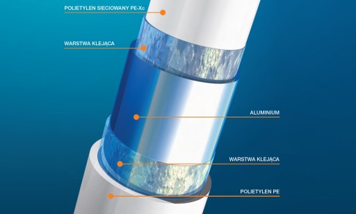 Wewnętrzna rura z polietylenu sieciowanego elektronowo, zewnętrzna rura z polietylenu (PEHD), pomiędzy nimi wkładka aluminiowa, wszystko połączone specjalnym klejem.