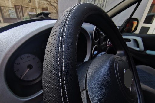 Pokrowiec na kierownicę wykonany z wysokiej jakości ekoskóry perforowanej połączonej z ekoskórą gładką.