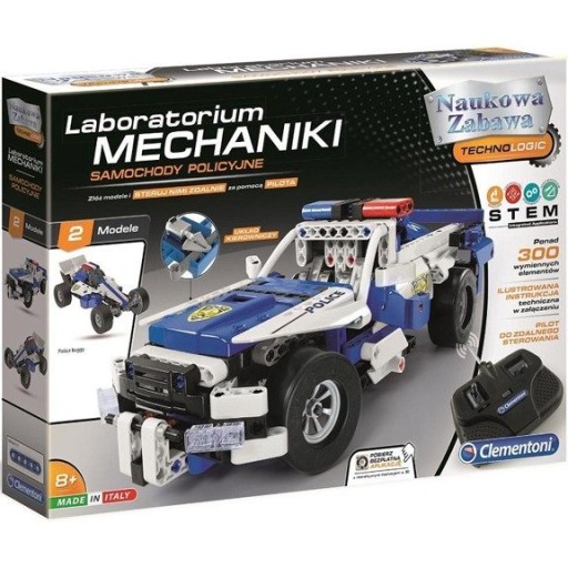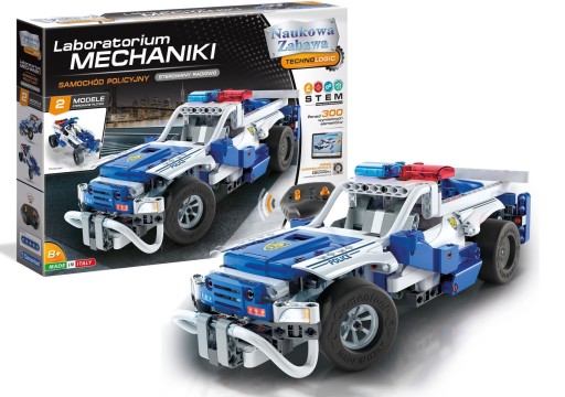 Niesamowity zestaw naukowy do odkrywania zasad mechaniki i inżynierii z dwoma modelami samochodów policyjnych.