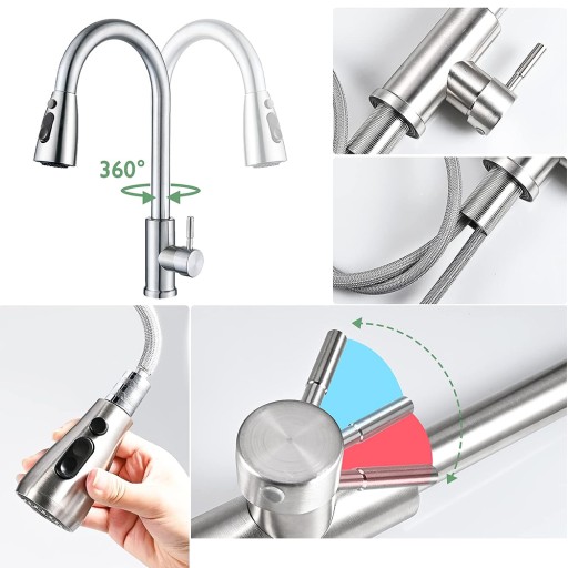 - Wyciągany kran kuchenny wykonany jest z wysokiej jakości stali nierdzewnej 304, która jest odporna na starzenie, wysokie ciśnienie i szczelność.