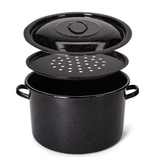 Garnek emaliowany z pokrywką oraz wkładką perforowaną. Główne przeznaczenie do wekowania słoików ale także do gotowania. Bardzo solidny, łatwy w użytkowaniu i praktyczny. Niewątpliwie element niezbędny w każdej zorganizowanej kuchni.