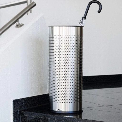 Stylowy oraz wysokiej jakości stojak na parasole wykonany ze stali nierdzewnej z ozdobnymi przetłoczeniami.