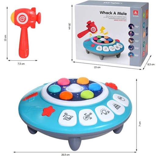 - Przycisk z planetą i młoteczkiem uruchamia tryb, w którym zapala się dany przycisk, a dziecko musi odpowiednio w niego trafić. Jeśli trafimy dobrze 15 przycisków, włącza nam się melodia, która nas nagradza. Natomiast, jeśli nie trafimy w cztery przyciski pod rząd, słyszymy krótki dźwięk wskazujący na porażkę. Za każdym razem odpowiedni dźwięk wskazuje nam czy trafiliśmy odpowiednio w kolor czy też nie. Po wygranej lub przegranej zabawa sama się wznawia - można grać bez końca!