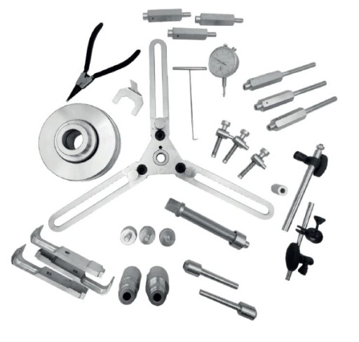 Specjalistyczny zestaw do prawidłowego montażu i regulacji suchego sprzęgła dwumasowego DSG. Zestaw wymaga stosowania fabrycznej procedury wymiany, kontroli i regulacji luzów za pomocą obciążników, przymiarów oraz czujnika zegarowego.