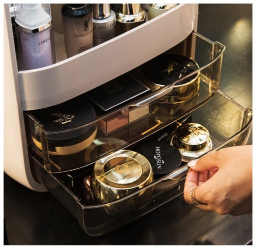 Organizer posiada liczne szufladki oraz dużą gablotkę, w której można przechowywać perfumy, balsamy i kremy. Dzięki niemu utrzymasz porządek i ład w swoich codziennych drobiazgach. Wykonany z wysokiej jakości tworzywa, organizer prezentuje się niezwykle pięknie i stylowo. Przeźroczyste wieko umożliwia łatwe znalezienie potrzebnego kosmetyku.