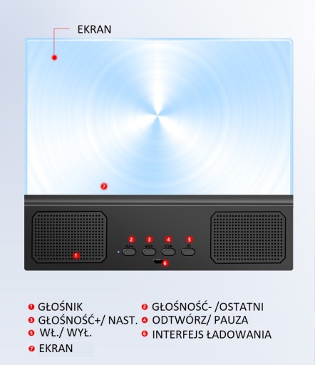 - Głośnik: 3 W / 4 Ω - Regulowana głośność