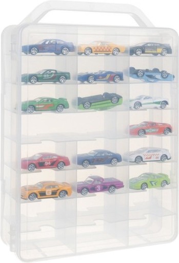 - DWUSTRONNA – walizka jest wyposażona z dwóch stron w drzwiczki, a z każdej ze stron po 23 miejsca na samochodziki. Drzwiczki są zamykane na zaciski, dzięki temu autka nie wypadną.
