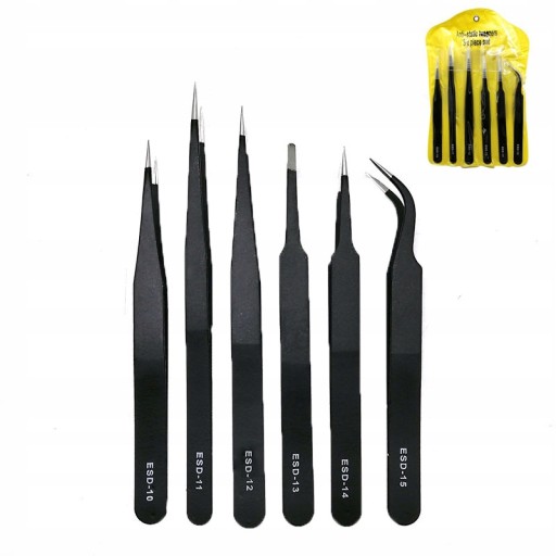 Zestaw sześciu precyzyjnych pęset dla elektroniki. Antymagnetyczne, antystatyczne, odporne na kwasy i nie rdzewiejące. Dobra jakość, ostre, utwardzone końcówki. Część robocza precyzyjnie szlifowana. Pozbawiona właściwości magnetycznych, nie przylegają elementy metalowe oraz resztki cyny, idealnie nadają się do elementów wrażliwych na pole magnetyczne. Praca jest precyzyjna i przyjemna. Wszystkie pęsety są szlifowane na gładko w części chwytowej.