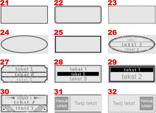 - Druga opcja daje Ci możliwość skorzystania z przygotowanych gotowych wzorów ramek oraz przykładowych rozmieszczeń tekstu. Wybierz wzór, który Ci najbardziej odpowiada. Zapamiętaj jego numer i podaj nam go w trakcie składania zamówienia (lub po jego złożeniu). Napisz jaki tekst mamy umieścić na pieczątce. Opisz w jakim miejscu ma być on umieszczony. Jeżeli na pieczątce ma się znaleźć też Twoje logo prześlij nam je na maila po złożeniu zamówienia.