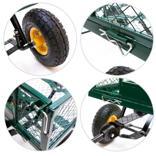 Duże, gumowe, pompowane, łożyskowane koła pozwalają na płynną jazdę, nawet przy dużym obciążeniu. Wygodę użytkowania zapewnia możliwość składania burt.