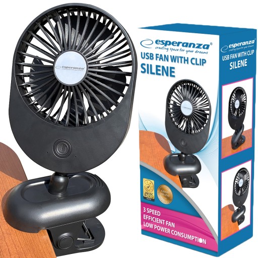 Kompaktowy mini wentylator Esperanza SILENE USB z montażowym uchwytem szczękowym.