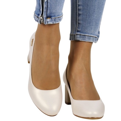 BUTY DAMSKIE CZÓŁENKA NA KLOCKU WYGODNE I STABILNE BEŻOWE PERŁOWE