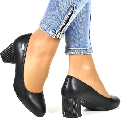 CZÓŁENKA DAMSKIE BUTY NA OZDOBNYM KARBOWANYM OBCASIE CZARNE LICO
