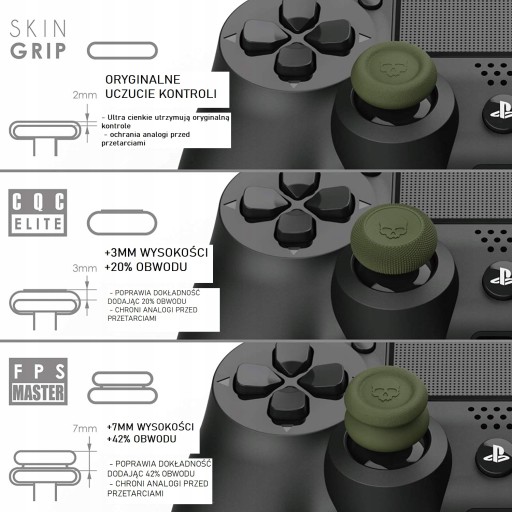 - Nakładka Skin Grip to akcesorium zapewniające lepszy chwyt i kontrolę nad kontrolerem. Jest niewiele większa od oryginalnej gałki, ale wykonana z materiału antypoślizgowego, co zapobiega przypadkowemu ślizganiu się z dłoni i poprawia precyzję sterowania.