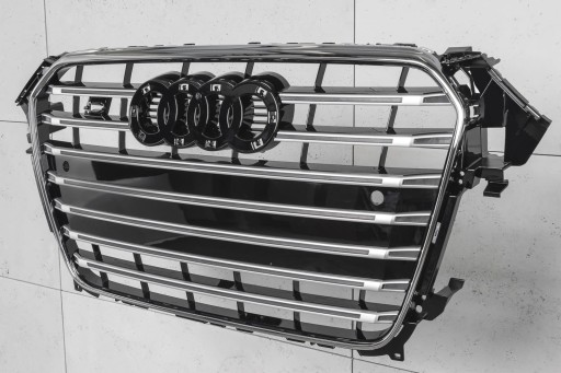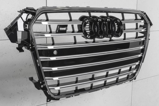 Stylizacyjny grill, atrapa chłodnicy, chromowany, dedykowany dla AUDI A4 (B8) 2012-2016 (wersja po faceliftingu). Grill posiada ramkę tablicy rejestracyjnej.