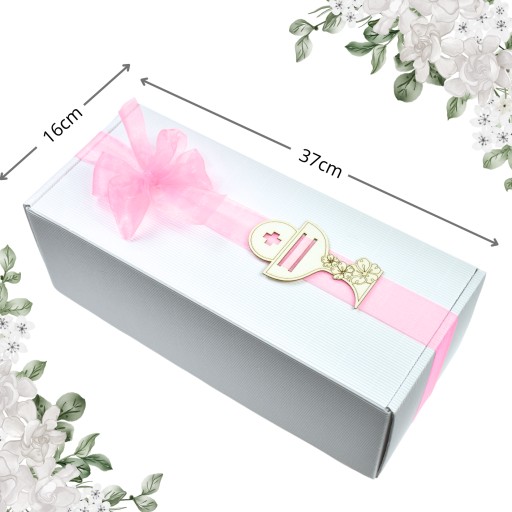 - pudełko, karbowany eco kartonik wypełniony wełną drzewną, wymiary: 37x16x12,5 cm z emblematem przewiązanym tasiemką