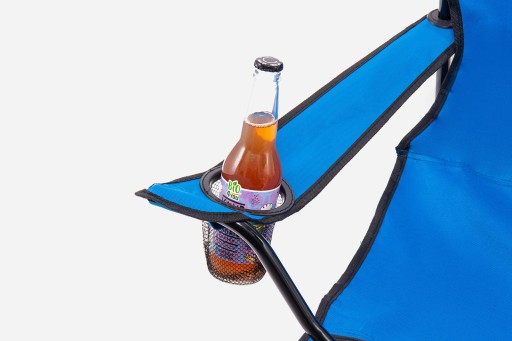 Składane, komfortowe krzesło turystyczne z uchwytem na butelkę w kolorze niebieskim.