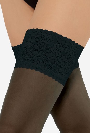 Praktyczne i delikatne, silikonowe paski stanowią gwarancję niezawodności pończoch samonośnych. Bardzo dobrze przylegają do ciała. Dzięki ich zastosowaniu materiał nie zsuwa się, ani nie marszczy. Silikonowe paski zostały zamaskowane szerokim paskiem dekoracyjnym - ze zmysłowej koronki.