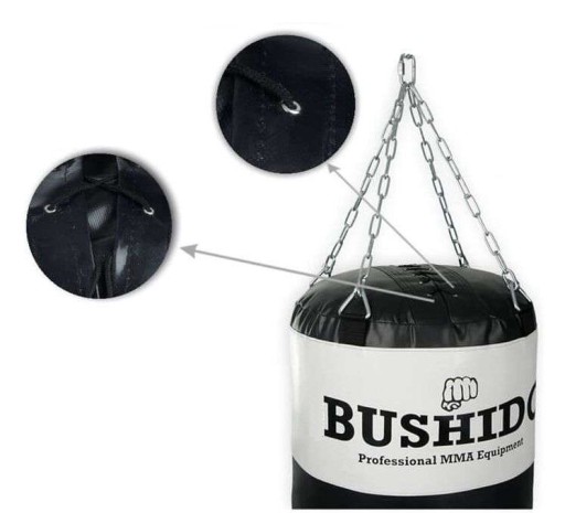 Największe obciążenie worka spoczywa na jego dolnej ściance. Właśnie dlatego worki Bushido posiadają podwójne wzmocnione dno oraz dodatkowe taśmy wzmacniające jego wytrzymałość. Worek jest wyposażony w dodatkowe mocowanie umożliwiające przymocowanie worka od dołu ograniczając jego kołysanie się podczas treningu. Worki należy mocować na ekspanderach, nie należy do tego celu używać sztywnych linek.