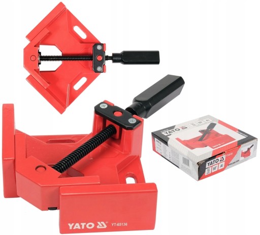 Imadło kątowe do mocowania elementów pod kątem 90°. Korpus wykonany z aluminium podstawa 150 x 150 mm głębokość / grubość max. mocowanych elementów ok. 70 mm, wysokość zew. ścian ok 55 mm grubość ścian ok 13 mm w podstawie otwory do mocowania 10 mm x 32 mm. Śruba metalowa toczona fi 12mm umocowana w przegubie daje możliwość zmiany kąta mocowania poprzez docisk do jednej ściany, pokrętło plastikowe.