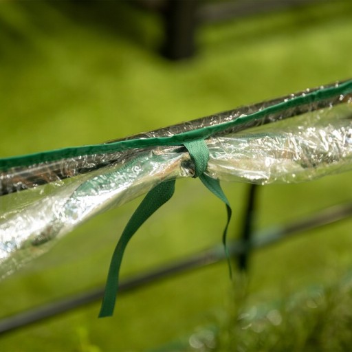 Montaż jest naprawdę bardzo szybki, zajmuje zaledwie 5 min. Wystarczy łącznikami połączyć rurki i naciągnąć folię oraz przywiązać tasiemki do rurek. Dla poprawy stabilności można przytwierdzić całość do ziemi.
