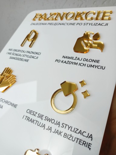 Akrylowa tabliczka Zalecenia Pielęgnacyjne Paznokcie z lustrzanymi napisami i piktogramami.