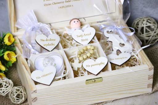 (różaniec, delikatny woreczek z organzy, piękny aniołek z modeliny, uroczy drewniany słonik na szczęście i wyjątkowe pudełeczko w kształcie serca na różaniec lub medalik)