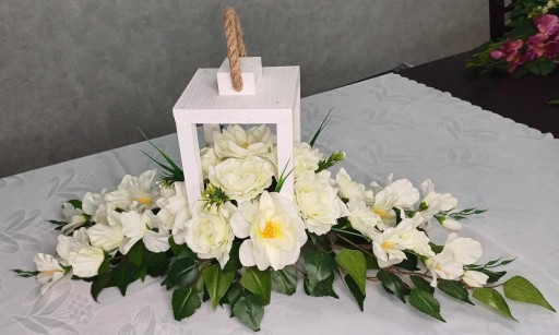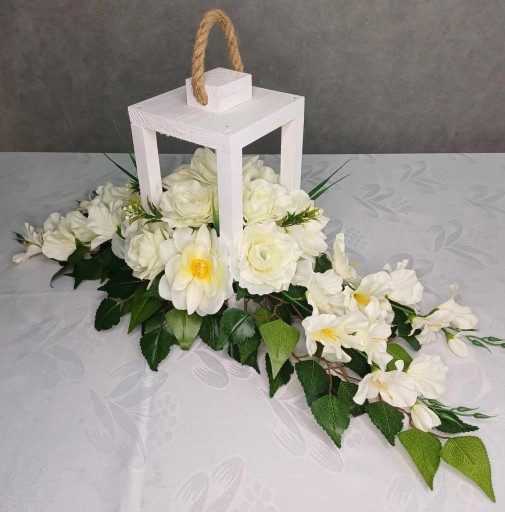 Wiązanka nagrobna wykonana ręcznie z wysokiej jakości sztucznych kwiatów w donicy zalanej betonem.