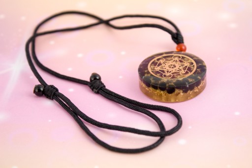 PIĘKNY NASZYJNIK ORGONITOWY ŻYWICA OBSYDIAN GRANAT SZEŚCIAN METATRONA