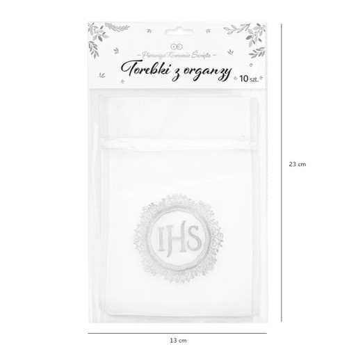Woreczki z organzy IHS biało-srebrne to eleganckie i stylowe opakowania na prezenty dla gości komunijnych. Woreczki wykonane są z delikatnej, białej organzy, a ich ozdobą są srebrne motywy hostii i listków, które nadają im wyjątkowego charakteru. Każdy woreczek jest zamykany przy pomocy białej tasiemki, dzięki czemu można w nim bezpiecznie przechowywać różaniec, medalik lub inną biżuterię. Woreczki mają wymiary 10 cm x 15 cm, co czyni je idealnymi do przechowywania małych przedmiotów. Dodatkowo, ich elegancki wygląd sprawia, że są idealnym uzupełnieniem dekoracji stołu podczas uroczystej komunii. Zestaw zawiera 10szt. woreczków, co pozwoli na zapakowanie upominków dla wszystkich gości.
