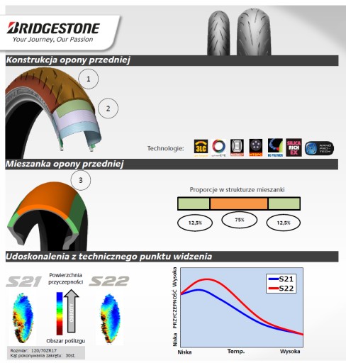 - 2) Zastosowanie najnowocześniejszej technologii konstrukcji opasania Bridgestone MS-Belt z technologią HTSPC zapewniają maksymalne parametry prowadzenia i stabilność przy wysokiej prędkości.