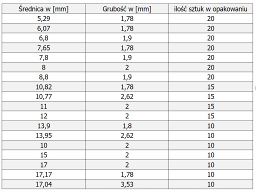 ŚREDNICA WEWNĘTRZNA (MM) - GRUBOŚĆ (MM) - ILOŚĆ SZTUK