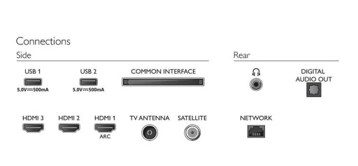- Gniazda we/wy: 1 x RJ-45 LAN , 2 x USB 2.0 , 3 x HDMI , 1 x 3,5 mm minijack , 1 x Wejście antenowe , 1 x Gniazdo CI/Cl+ , 1 x Audio out