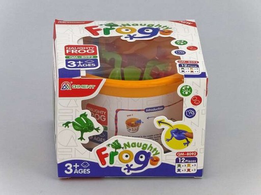 Zawartość: pojemnik na żabki, 12 żabek w 4 kolorach.
