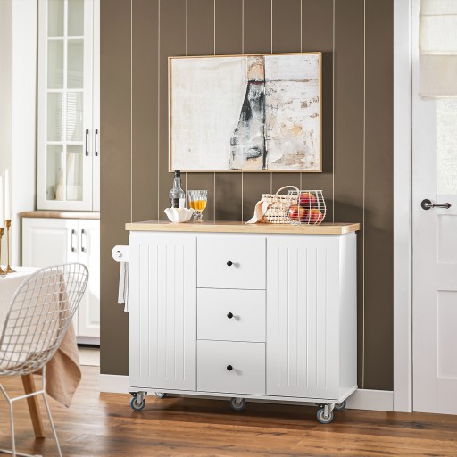 Ten wózek kuchenny ma 2 drzwiczki oferowane przez wiele przyborów kuchennych. Półki za drzwiami z regulowaną wysokością. W 3 szufladach można umieścić małe przedmioty, które są łatwo dostępne i zabezpieczone na kurzu.