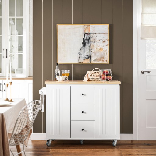 wyposażony w klasyczny wózek kuchenny w stylu wiejskim z eleganckimi uchwytami i dopasowanymi okuciami, który harmonijnie wpasuje się w ogólny obraz.