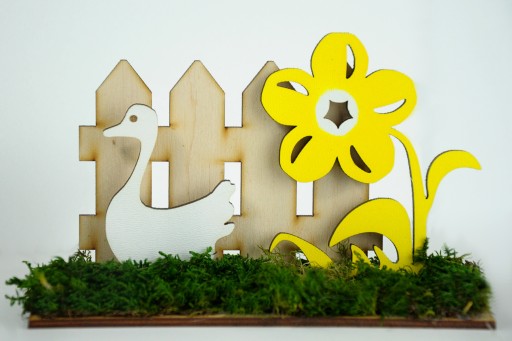 Kompozycja świąteczna wykonana ze sklejki 3mm. Wysokość 5 cm, szerokość 9 cm, głębokość podstawy 3,6 cm. Dodatkowo ozdobiona mchem chrobotkiem. Świetnie sprawdzi się jako ozdoba wielkanocna zarówno samodzielnie jak i w w większej kompozycji. Na innej naszej aukcji można zakupić taką samą większą gąskę. Razem tworzą bardzo ładną kompozycję wielkanocną.