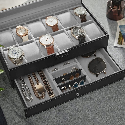 ✅Etui posiada komorę na zegarki, widoczną przez wieczko, drugą na biżuterię natomiast w wysuwanej szufladzie.