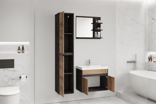 Łazienka to jedno z miejsc, które jako pierwsze odwiedzasz tuż po przebudzeniu, dlatego musi być urządzona w sposób wprawiający Cię w dobry nastrój. Zestaw wiszących mebli łazienkowych CYPRUS zachwyca prostą formą. Design bez uchwytów nadaje wnętrzu elegancji. Fronty wpuszczone w korpus oraz blendy w kolorze korpusu tworzą nietuzinkowy charakter. Zestaw, mimo że składa się z niewielu elementów, bez problemu pomieści niezbędne do przechowywania w tym pomieszczeniu rzeczy. Dodatkowo szeroka gama kolorystyczna, dostępna w naszej ofercie, pomoże Państwu w wyborze idealnego wariantu pasującego do wnętrza domu.