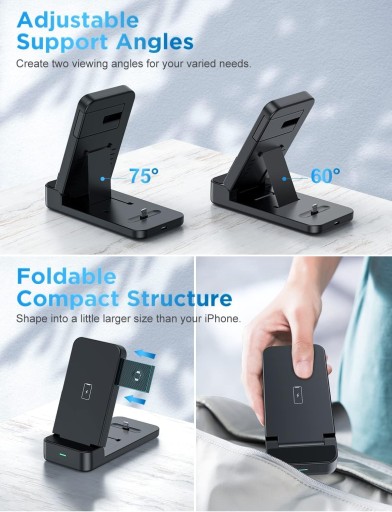 Dostępne są dwa kąty widzenia: 60 i 75 stopni. Schowaj część ładującą zegarek i złóż ładowarkę do kompaktowych rozmiarów na czas podróży. Obsługuje ładowanie poziome i pionowe. Zasilana przez dołączony adapter QC 3.0 o mocy 18 W, ładowarka zapewnia szybkie ładowanie maksymalnie 15 W dla Samsunga (7,5 W dla iPhone'a), maksymalnie szybkie ładowanie 3 W dla iWatch i maksymalnie szybkie ładowanie 5 W dla AirPods.
