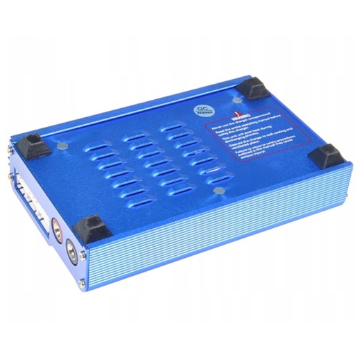 Do podłączenia wymagany jest mocny (5A) zasilacz stabilizowany 12V. Spadek napięcia poniżej 11V na zasilaniu spowoduje wyłączenie ładowarki. Zasilacz nie znajduje się w zestawie.