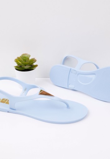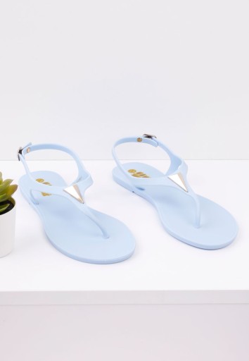 Japonki ,sandałki typu meliski. W całości wykonane z pachnącego tworzywa gumowego. Piękne zdobienie w postaci metalowego trójkata przy palcach. Zapinane na sprzączke. Idealne na basen ,plażę i do codziennego chodzenia .