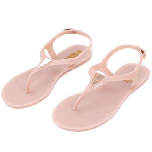 Japonki ,sandałki typu meliski. W całości wykonane z pachnącego tworzywa gumowego. Piękne zdobienie w postaci metalowego trójkata przy palcach. Zapinane na sprzączke. Idealne na basen ,plażę i do codziennego chodzenia .
