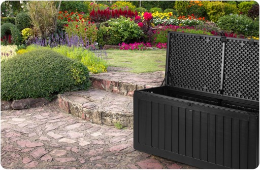 Pojemna skrzynia ogrodowa ułatwia przechowywanie w ogrodzie, na balkonie oraz wokół domu niezbędnych rzeczy, które użytkujemy na co dzień (poduszki, materace, pokrowce, zabawki, narzędzia) oraz wiele innych rzeczy.