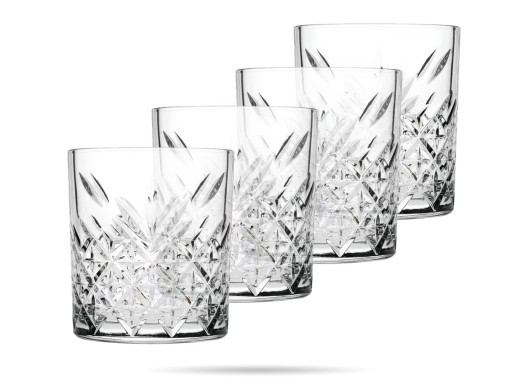 Zestaw 4 szklanek zdobionych wzorem ciętego szkła, przypominającym kryształ. Timeless pięknie rozprasza światło i efektownie eksponuje zawartość. Szklanki są stabilne i wygodne w użyciu, można podawać w nich soki, wodę i mocniejsze trunki.