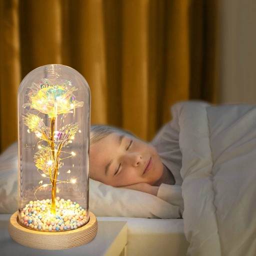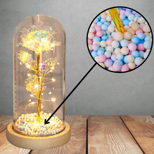 Nasza wieczna róża otoczona jest lampkami LED, które ją pięknie podświetlają. Dzięki temu prezentuje się niezwykle efektownie. Postawiony na nocnym stoliku, komodzie lub stole kwiat wytworzy magiczną atmosferę, która przypomni o Twoich uczuciach.