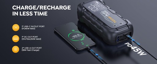 ➤【URZĄDZENIE DO SZYBKIEGO ŁADOWANIA DWUSTRONNIE O MOCY 45 W】 Dzięki technologii ładowania USB-C IN/OUT o mocy 45 W, akumulator rozruchowy można naładować od 0% do 100% w ciągu 2 godzin, a także szybko włączyć MacBooka i laptopa. Do pudełka do uruchamiania elektrycznego, w stanie gotowym przez około 24 miesiące, zawsze gotowe do pomocy. (Ładowarka ścienna 45 W nie jest dołączona)