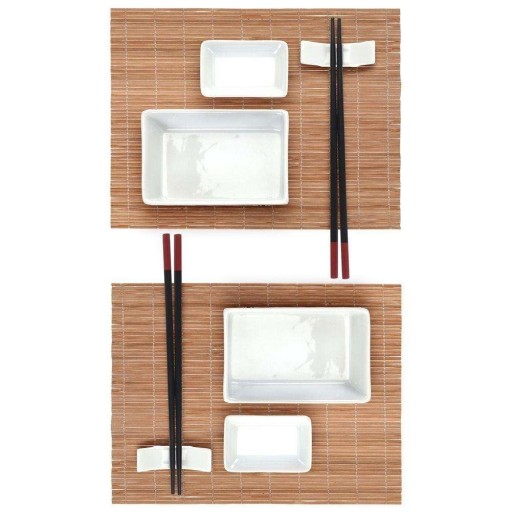 Praktyczny i elegancki zestaw do sushi z miseczkami. Jest idealny dla miłośników sushi ale poszczególne elementy można wykorzystać również do innych celów w zależności od pomysłu i zapotrzebowania. Idealny pomysł na prezent. W skład kompletu wchodzi: - porcelanowe miseczki duże : 12 x 8 cm x 2 szt - porcelanowe miseczki małe : 8 x 5 cm x 2 szt - podstawki pod pałeczki x 2 szt - bambusowe pałeczki x 2 szt - podkładki bambusowe x 2 szt