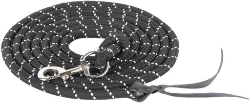 Długi, bardzo miękki uwiąż ze srebrnym karabińczykiem i skórzaną końcówką. Wygodnie leży w dłoni, idealny do pracy z koniem z ziemi oraz rajdów.